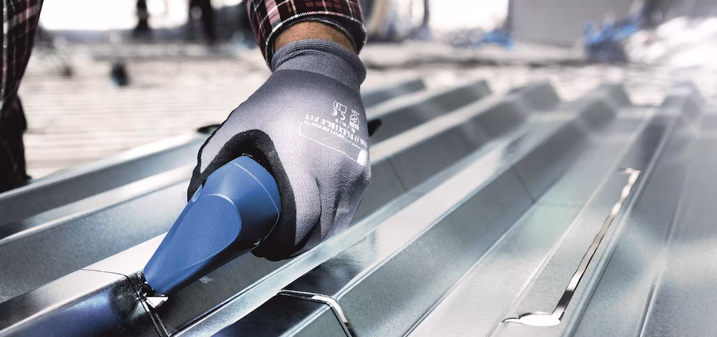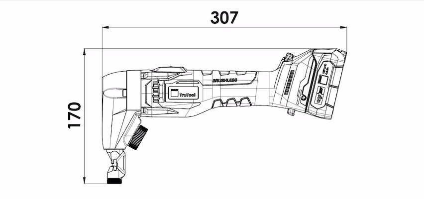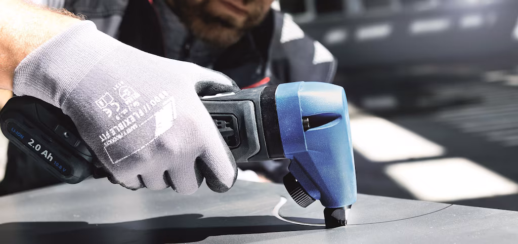 The compact 12V cordless machine is ideal for cutting flat and corrugated sheets measuring up to 1.6 mm thick. Cutting is corrosion-free and without distortion and the 4.0 Ah / 12V-LiHD rechargeable battery provides long runtimes. The soft grip ensures a secure hold and enables low-vibration operation. With the optionally available extension, you can always extend the range of applications and thus also cut deep profiles. The tools can be changed very easily using the rotary knob.