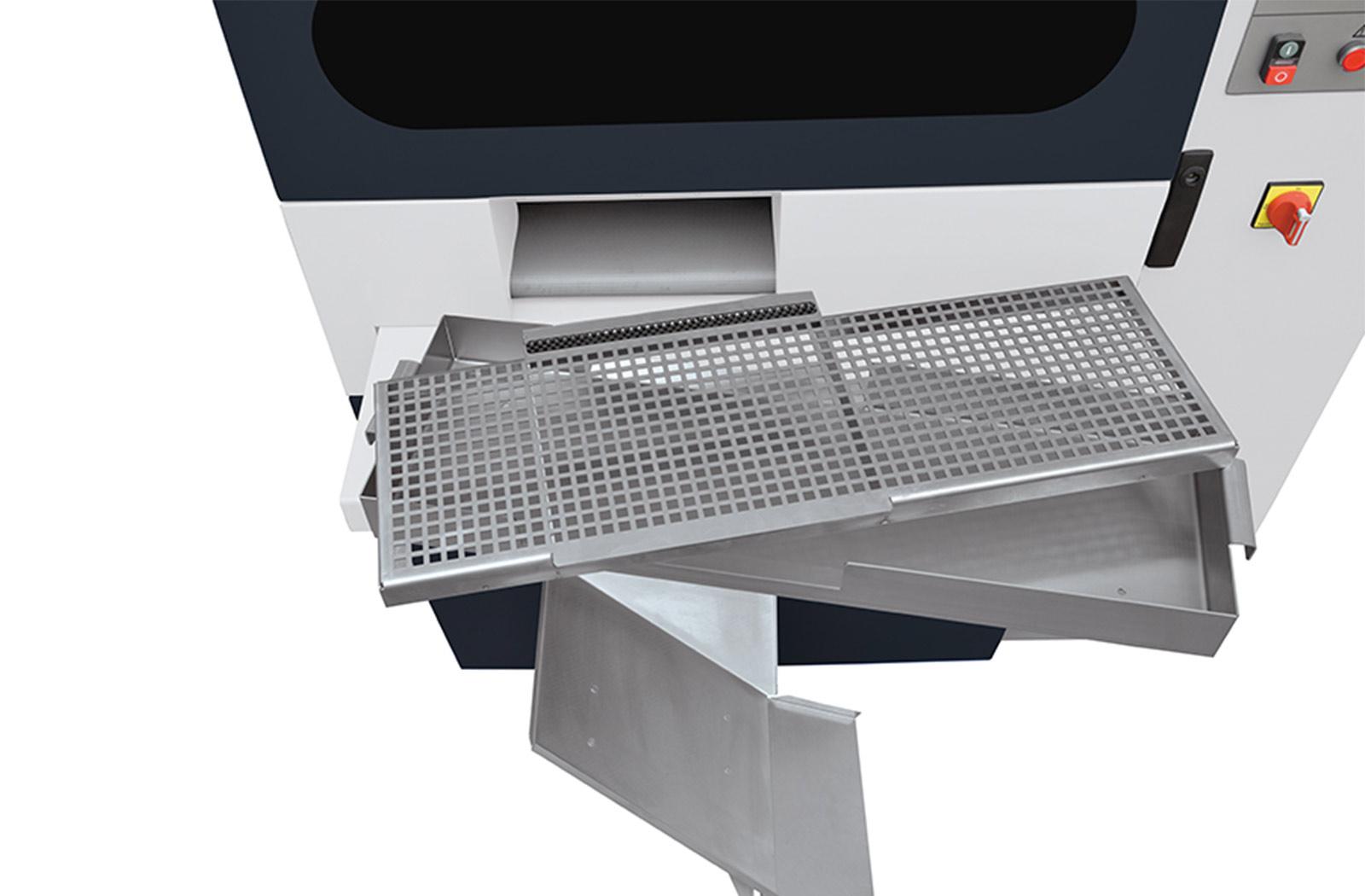 Small parts are returned to the front of the machine and gathered in a box. No extra walking back and forth for the operator.