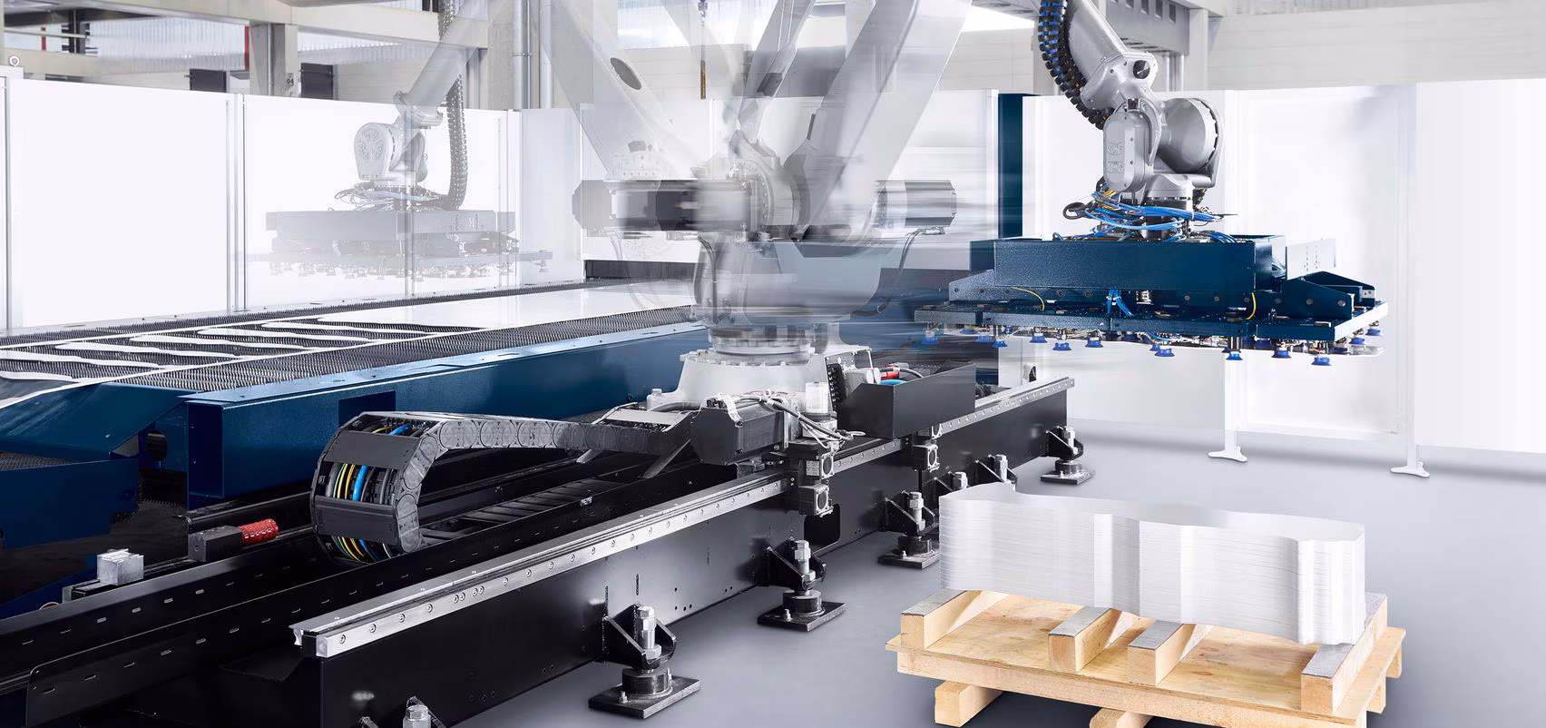 TruLaser cutting cell with TruFiber, including slat conveyor