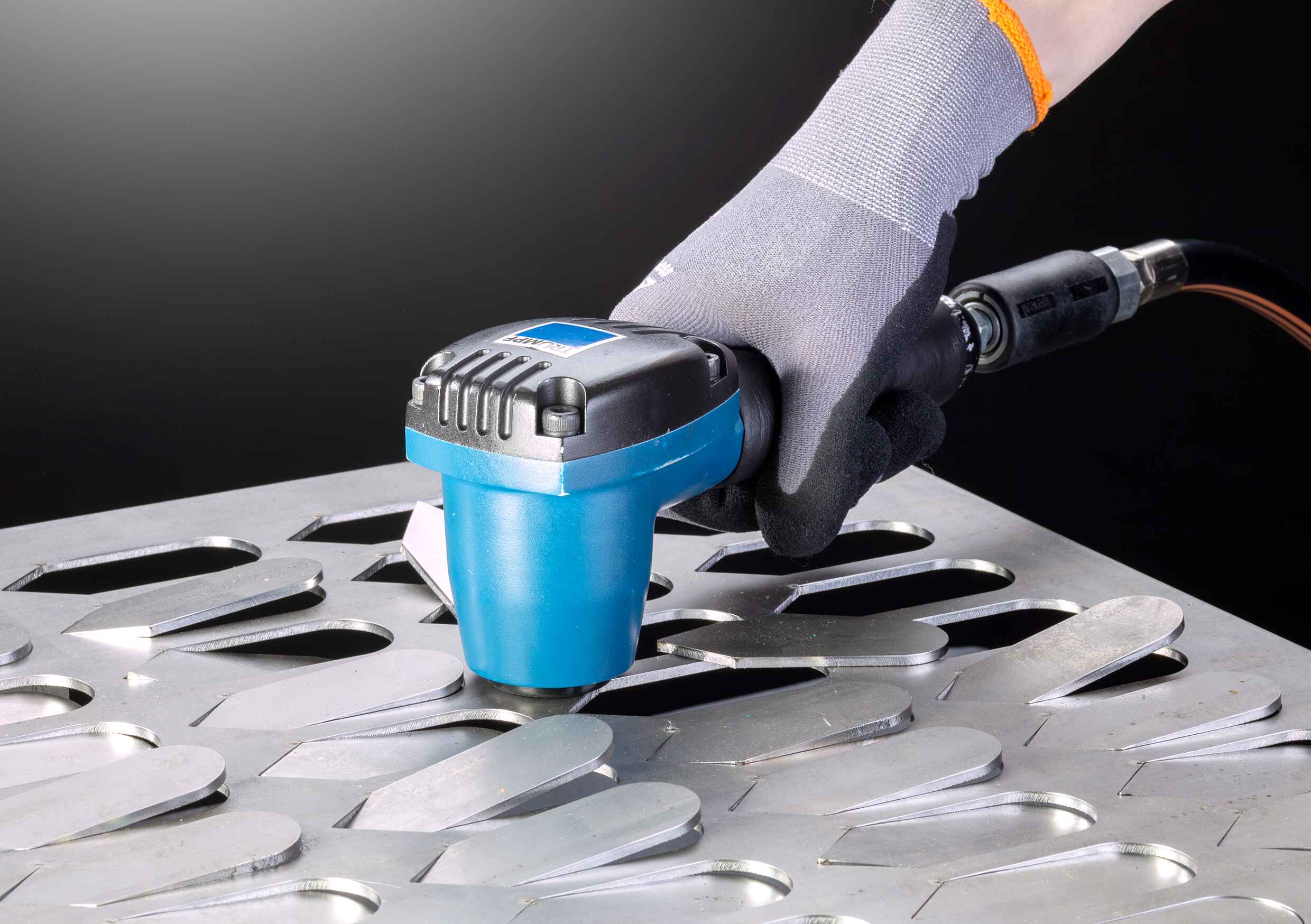 With the pneumatic part separator, the sheet metal composite is vibrated by impact pulses and the parts simply detach from the scrap skeleton. TruTool PS 100 is the perfect solution for separating nanojoint connections – machining is quick and easy. The part separator is also great for microjoint connections. With its compact design, the machine sits comfortably in the hand. The variety of holding positions on the machine head as well as on the handle means you can vary the holding position while you work. The result: an ergonomic and user-friendly mode of operation for efficient and fatigue-free work.