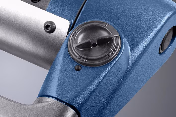An easy-to-use speed controller on the motor regulates the stroke rate and adapts to the respective application. This is particularly well-suited for working with scribed lines, where radii and stainless steel are frequently processed. Reducing the stroke rate achieves the optimal torque, especially for processing sheet thicknesses from 0.16 inches. Lower speeds are recommended for cutting stainless steel. The speed controller can be used to adjust the working speed in line with the respective working situation.