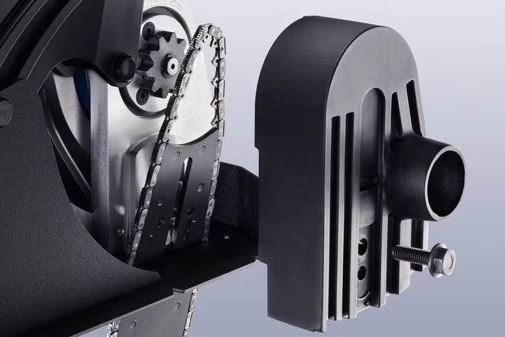 Replacing the chain and blade is quick and simple: Remove the protective cover, lift the saw chain with the blade out of the chain wheel, insert a new saw chain, and tighten. It is helpful and valuable to have the right combination wrench, kept in the machine and close at hand.